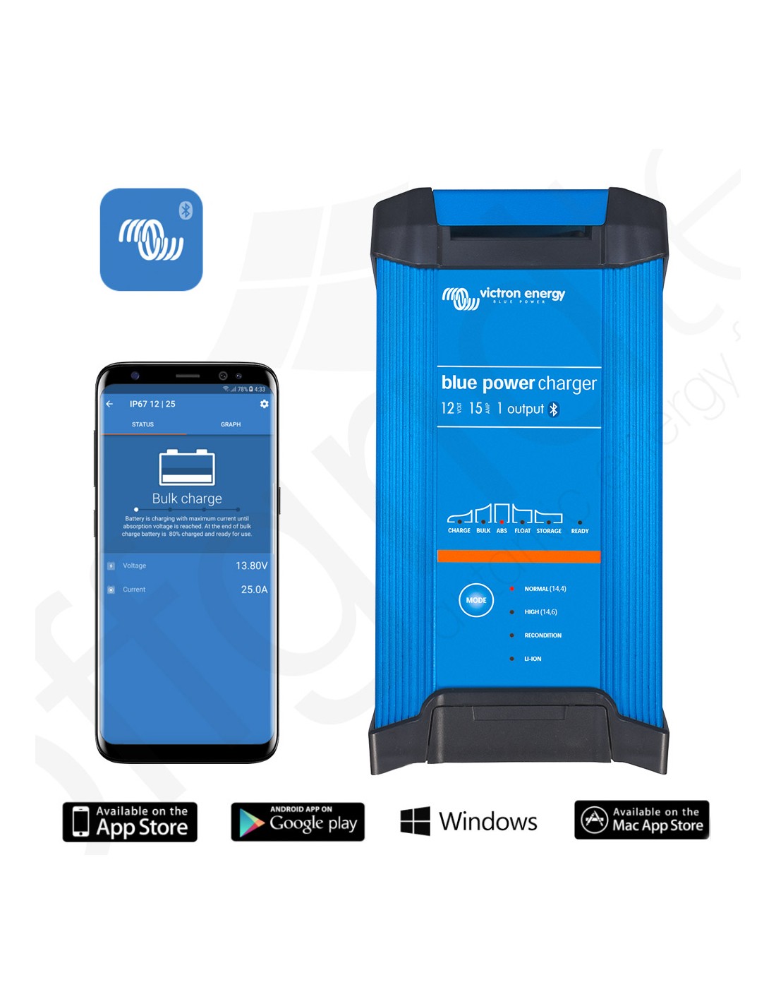 El cargador de baterías Blue Smart IP22 es la solución inalámbrica para monitorizar la tensión y la corriente, cambiar los ajustes y actualizar el cargador cuando aparecen nuevas funciones.