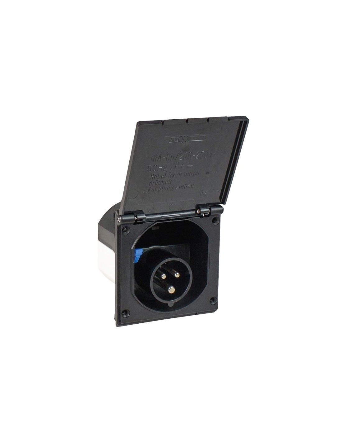 Toma exterior CEE17 macho, disponible en color blanco o negro, diseñada para la conexión a red eléctrica de 230V en furgonetas camper, autocaravanas y caravanas. Permite alimentar el sistema eléctrico del vehículo de forma segura cuando se conecta a una toma exterior.